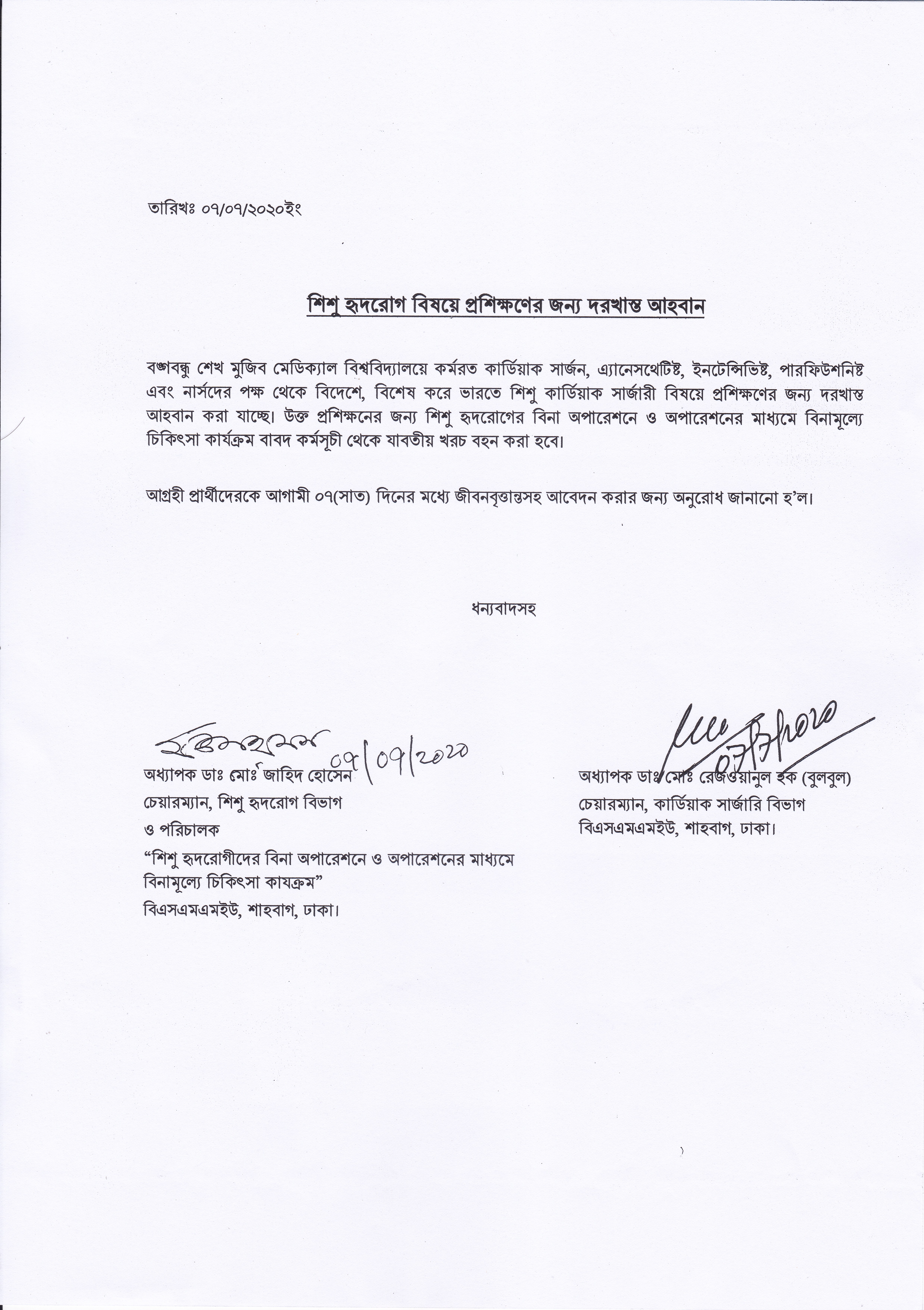 শিশু হৃদরোগ বিষয়ে প্রশিক্ষণের জন্য দরখাস্ত আহবান